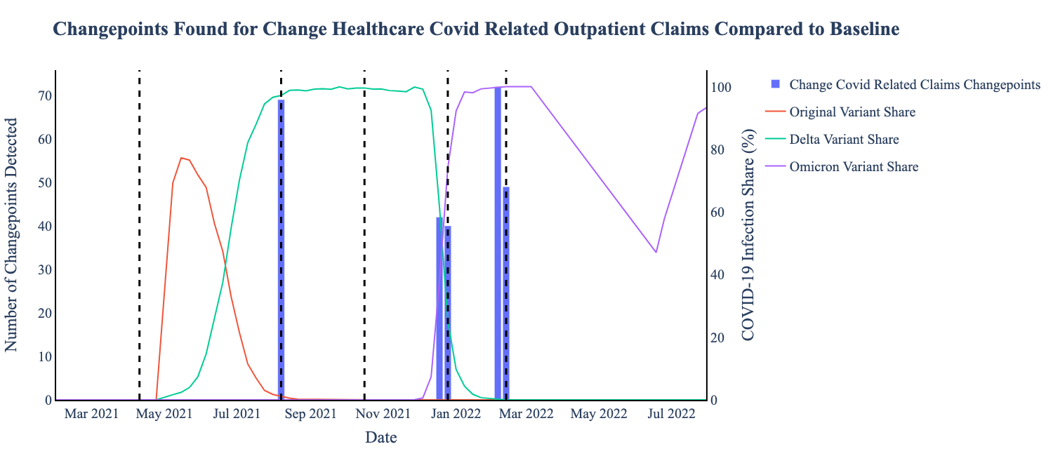 In November 2021, less than eighteen months after the first emergence of COVID-19, the National Institute for Communicable Diseases (NICD) in South Africa announced a new COVID-19 variant. Scientists subsequently discovered that the transmission, hospitalization, and mortality rates of the virus variant, known as the Delta variant, differed from the Original pandemic strain1. Methods that can detect these changes in underlying distributions of values in public health indicators (like cases, hospitalizations and deaths) can be useful in identifying changing health dynamics, like an emerging virus variant. We specifically use a technique called changepoint detection to analyze the power of Delphi’s historically available indicators to identify changes in COVID-19 variant behavior between January 30, 2021 and September 17, 20222.